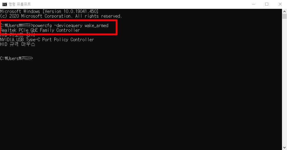 명령 프롬프트 창이 생성되면 바로 'powercfg -devicequery wake_armed'를 입력하고 엔터를 치면 절전모드를 해제할 수 있는 장치들의 목록이 나열됩니다. 이 목록에서 마우스와 키보드를 제외한 나머지 장치가 절전모드를 자동으로 해제해버리는 경우 절전모드를 해도 다시 PC는 재가동됩니다. 목록을 확인 후 장치 관리자에서 변경만 해준다면 절전모드를 정상적으로 사용할 수 있습니다.