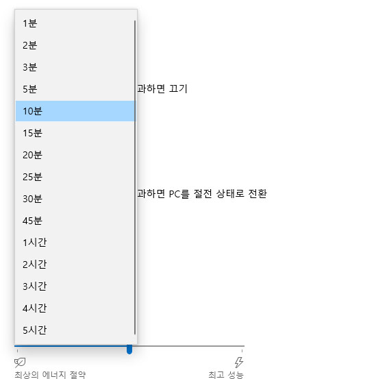 절전 모드 옵션을 보면 전원 사용 시 '다음 시간이 경과하면 PC를 절전 상태로 전환' 옵션에서