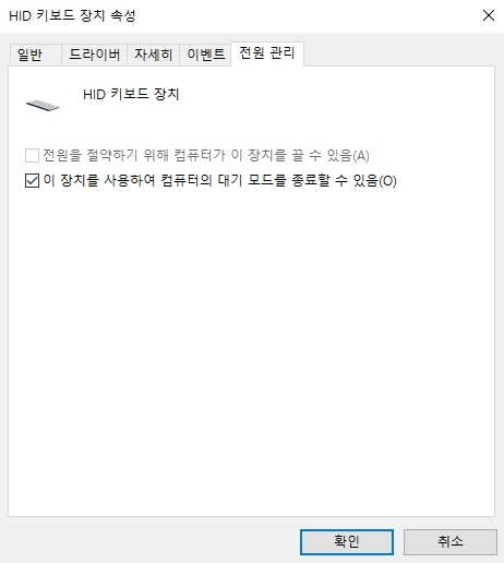 속성 옵션 창을 열고 '전원 관리'에 들어가시면 대기 모드를 종료할 수 있는지 체크박스를 확인합니다.