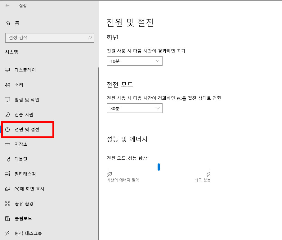 설정 창에서 좌측에 메뉴바에 있는 '전원 및 절전' 텝을 클릭하여 옵션을 변경할 수 있습니다.