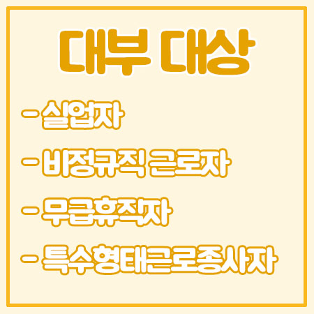 대부 대상자는 실업자, 비정규직 근로자, 무급휴직자, 특수형태근로종사자로서 직업훈련을 받을 예정이거나 받고 있다면 신청이 가능합니다.(직업 훈련이란, '내일배움카드' 를 통해 HRD-Net에 등록된 학원 수강을 받는 교육과정을 말함) 또, 실업자의 경우 실업급여를 수급하고 있다면 대부를 신청할 수 없습니다.