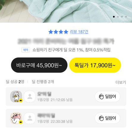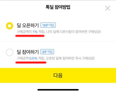구매할 때 직접 딜 오픈하기를 통해 구매하셔야 구매액 1%를 포인트로 적립받을 수 있습니다. 딜을 직접 오픈하면 딜 목록이 생성되면서 다른 사용자들이 내가 오픈한 딜 참여를 클릭할 시 딜 성공으로 구매가 이루어지는 방식이예요.